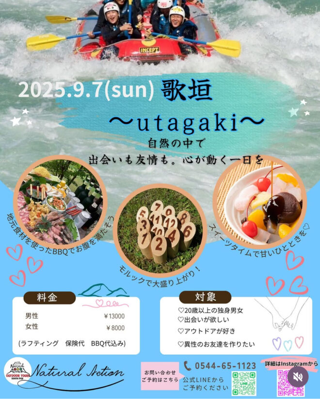 #歌垣 #utagaki #ナチュラルアクション #出会いイベント #アウトドア婚活 #BBQパーティー #ラフティング #モルック #富士宮イベント #自然と出会う #大人の出会い #恋活イベント